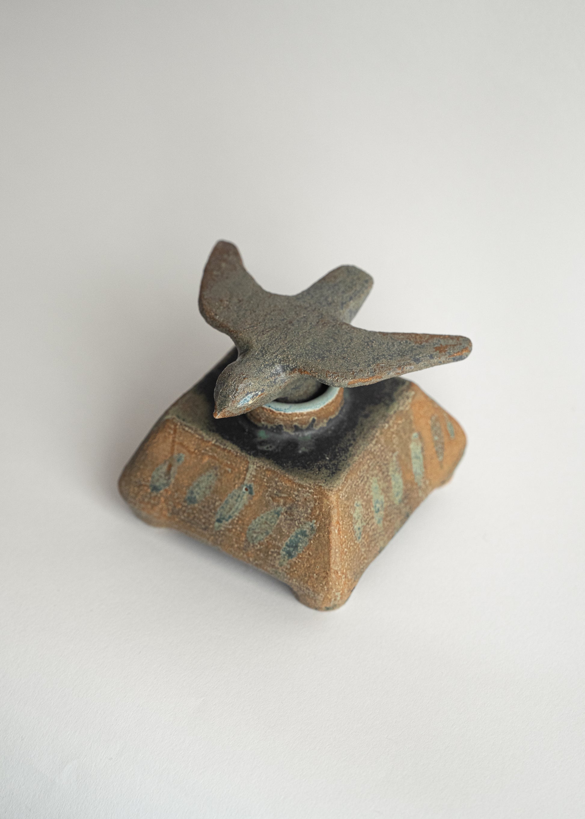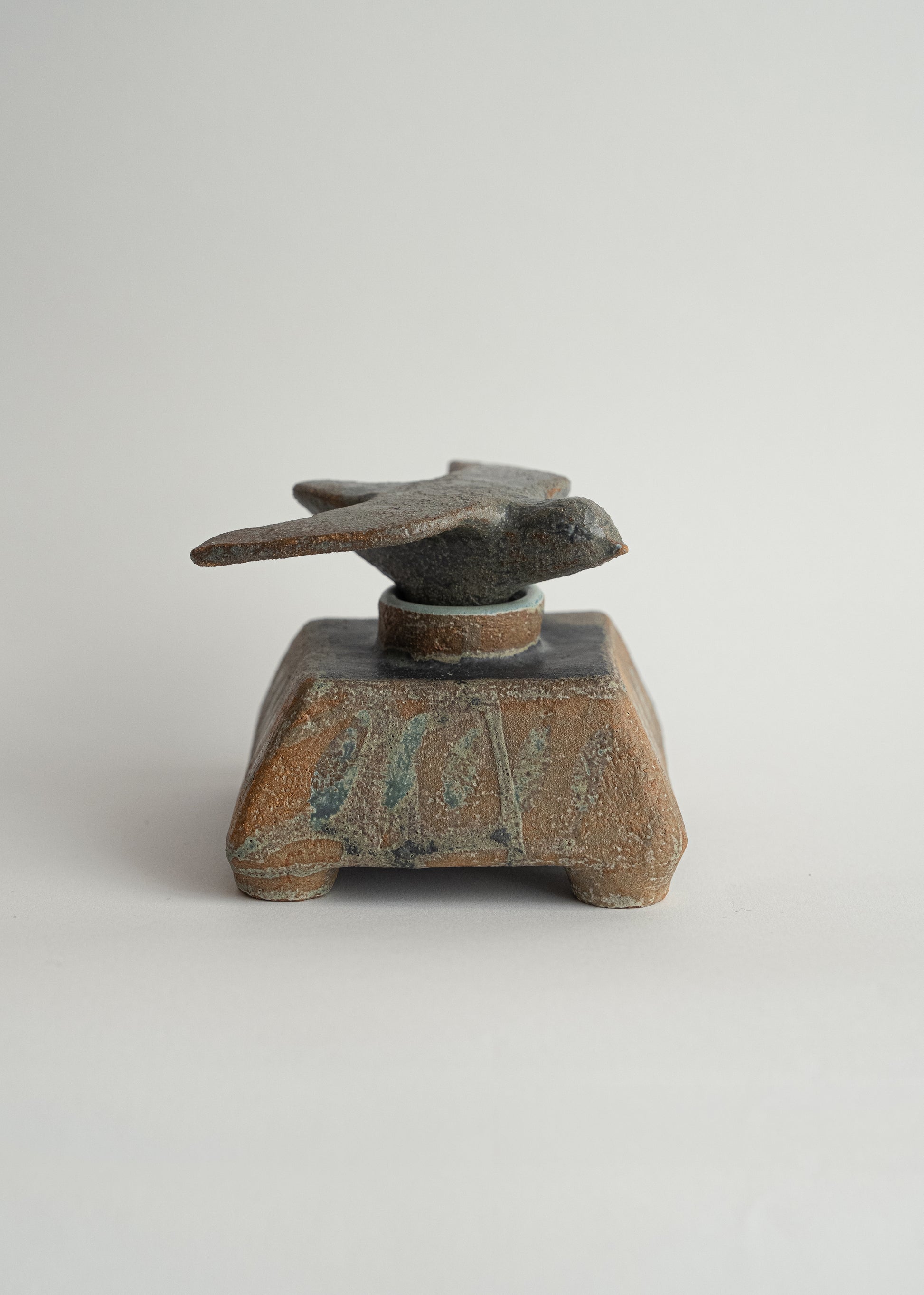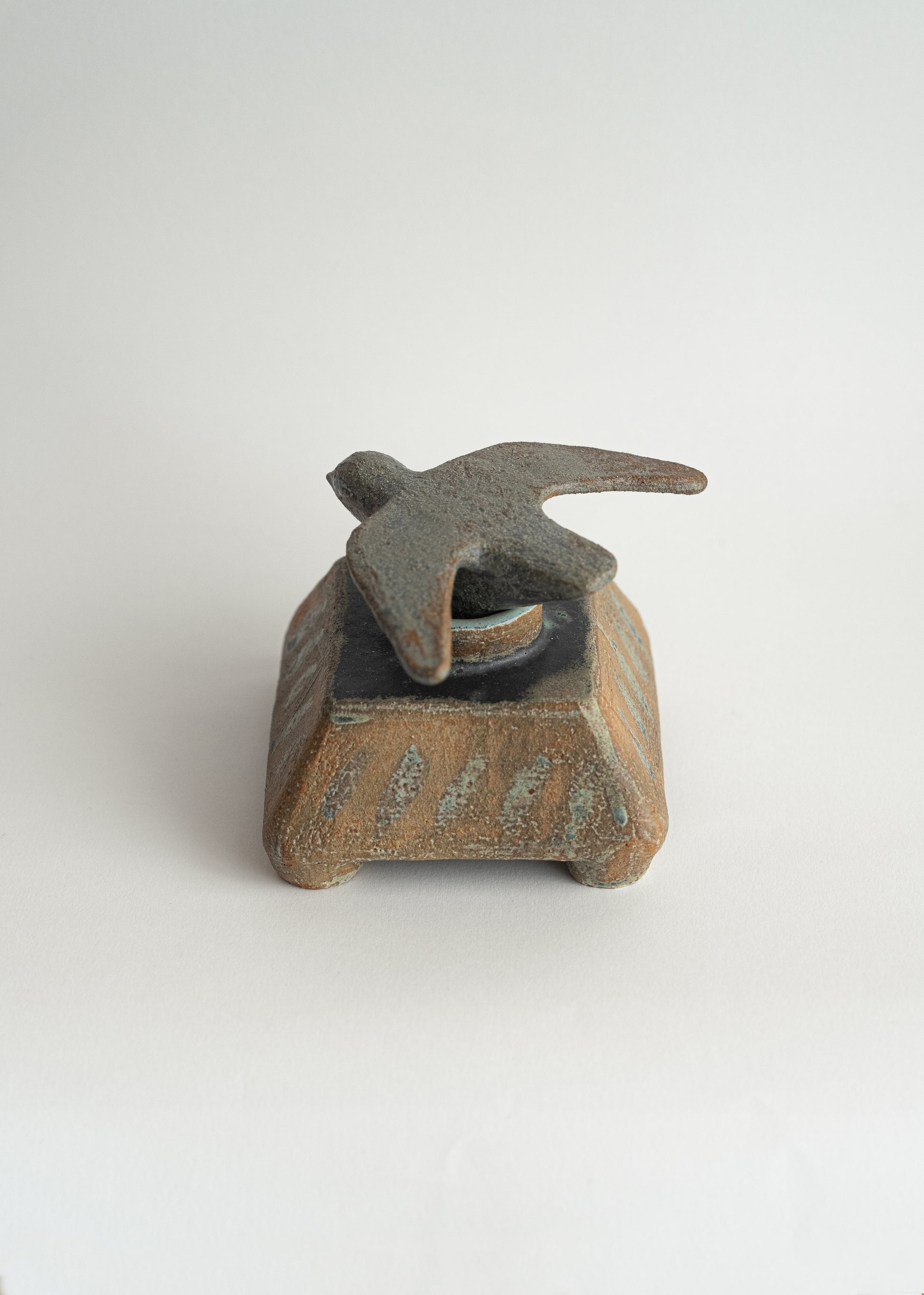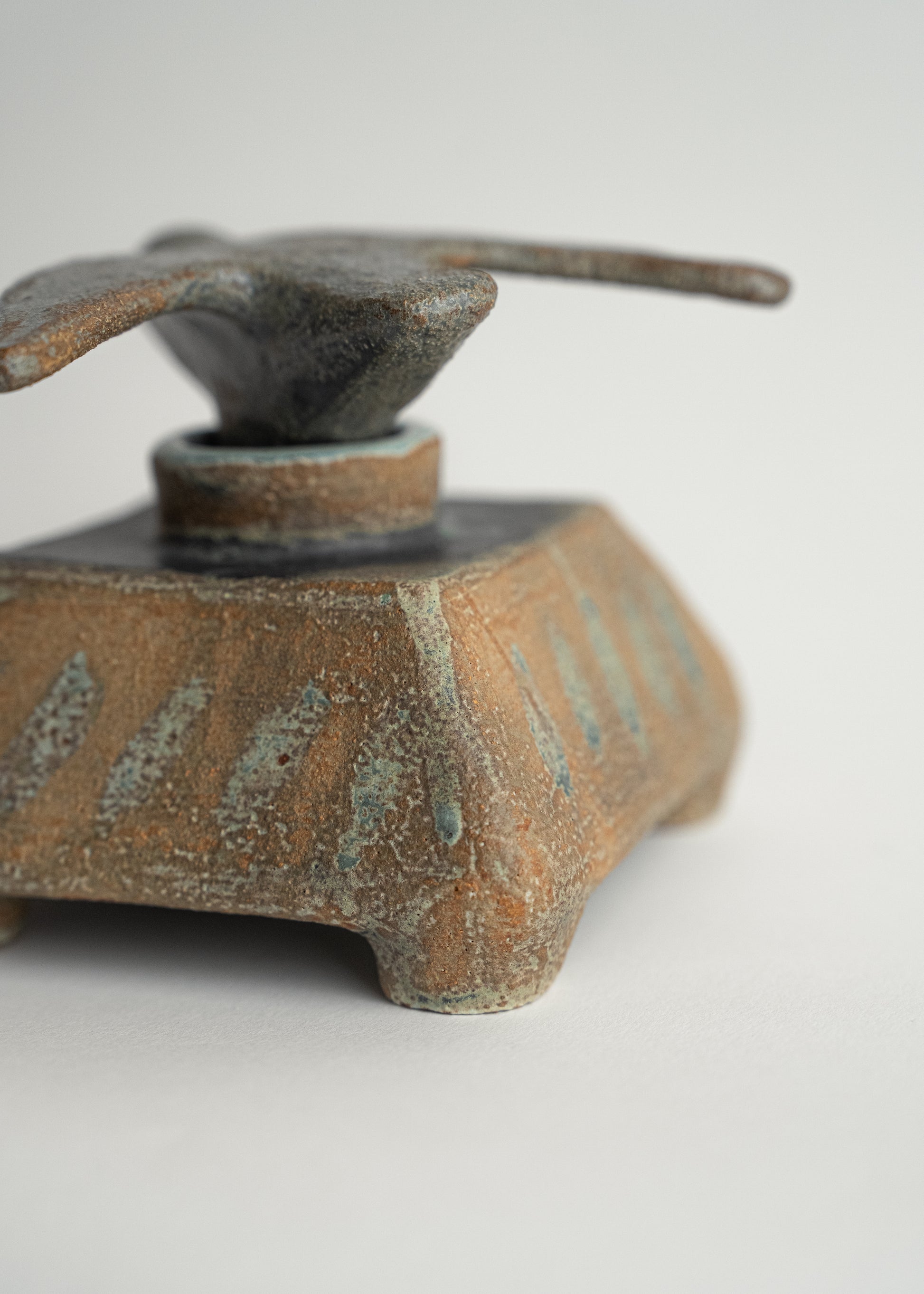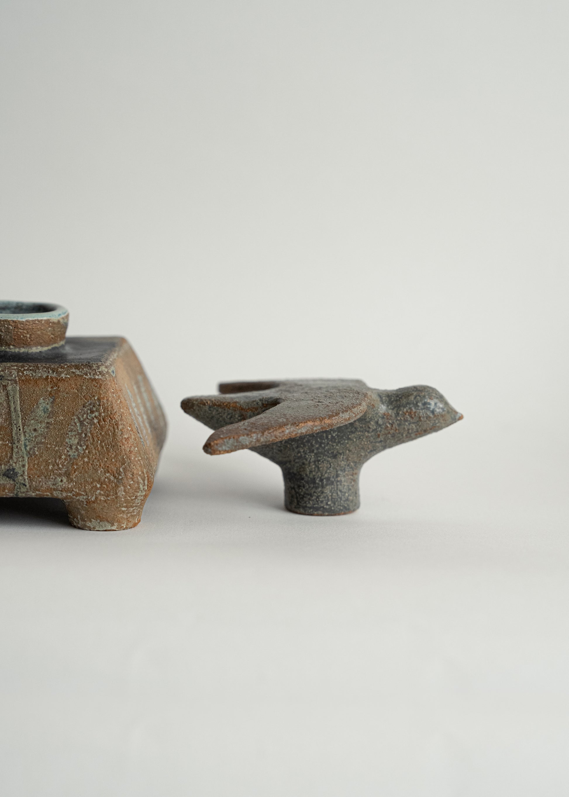 Sculptural object composed of two pieces, each hand built in pink chamotte stoneware and fired at 1250º. Finished with a green matte glaze with hand painted details. Interior glazed, perfect to store dried flowers, seeds or incense cones to subtly scent the environment.
