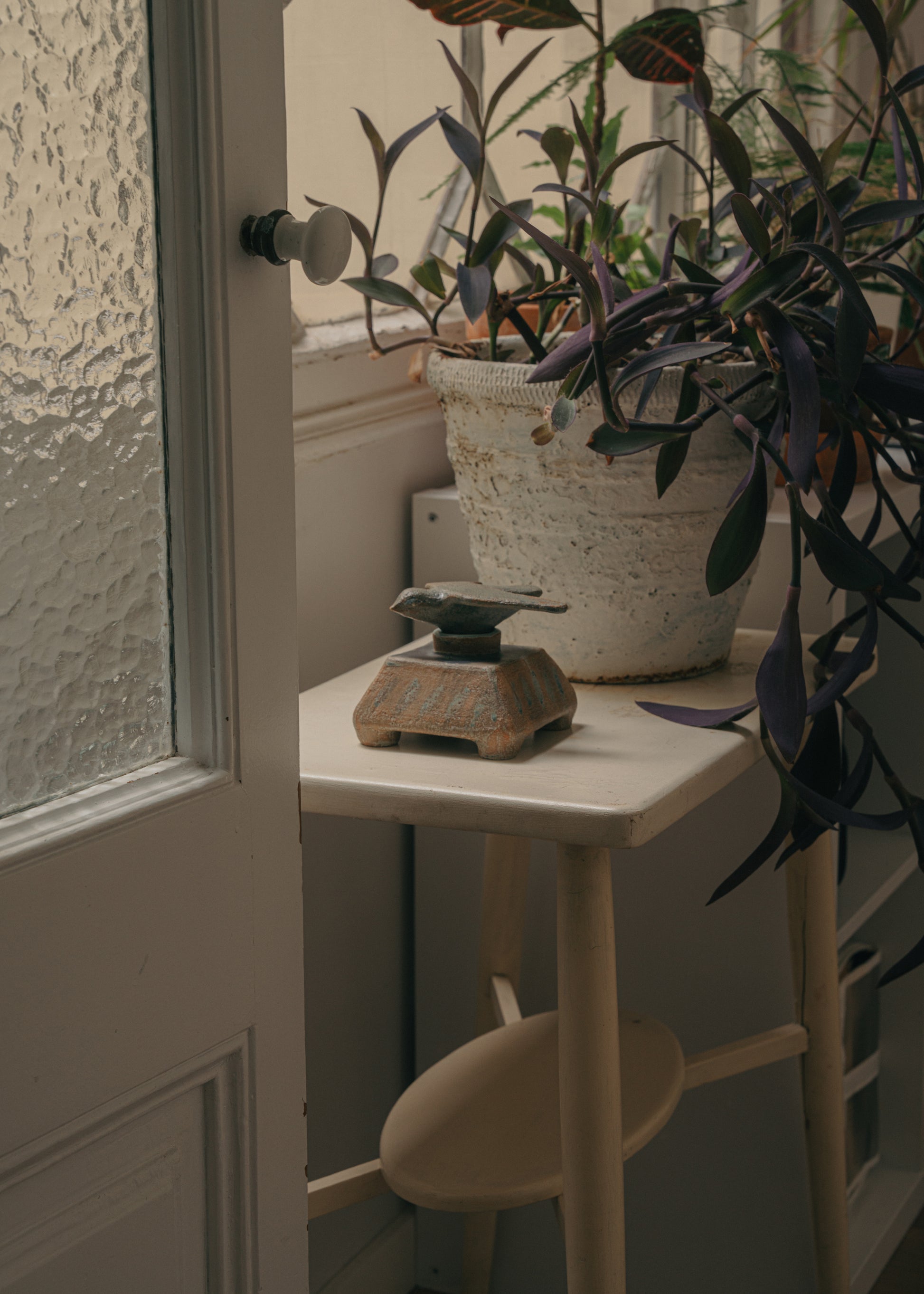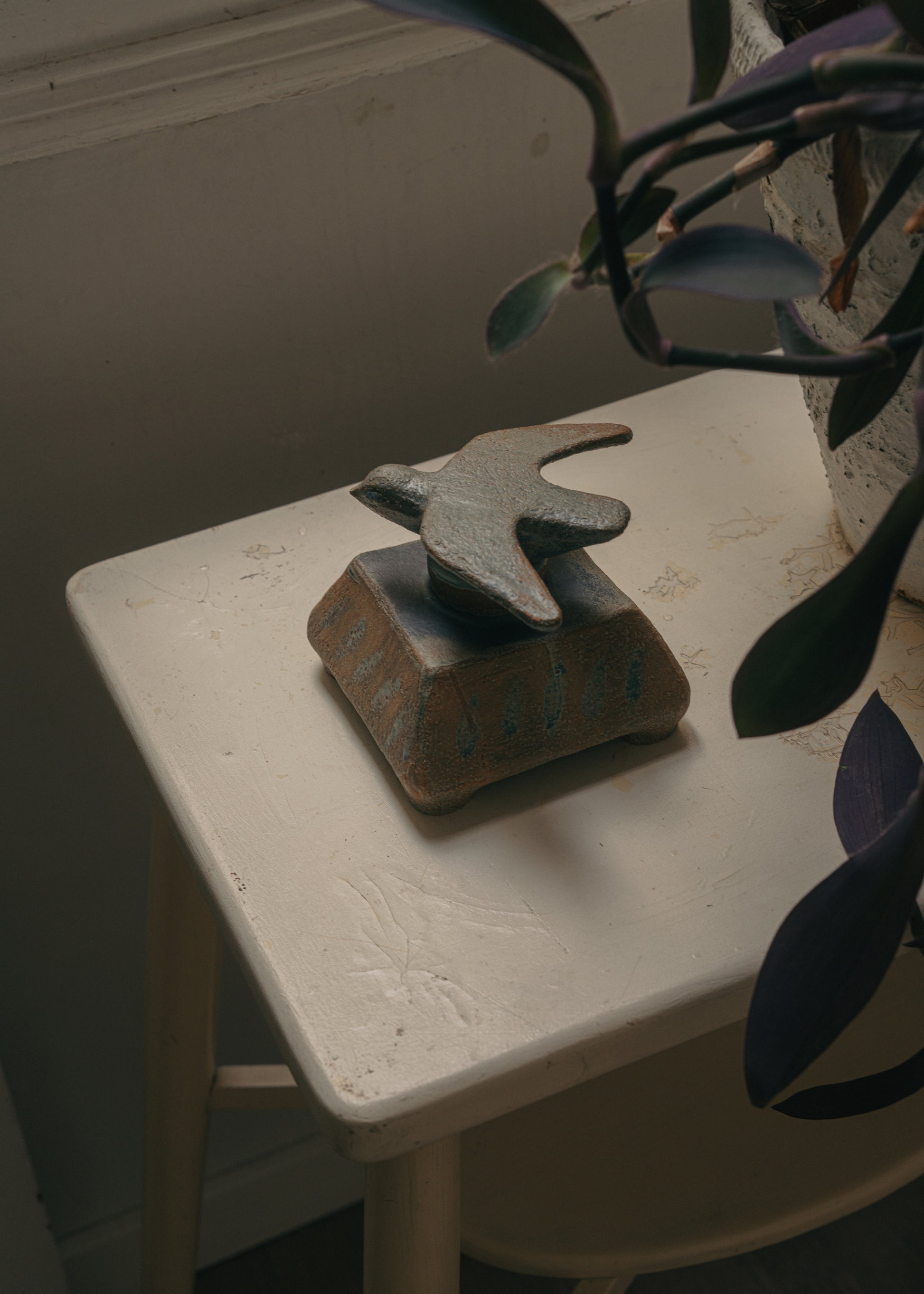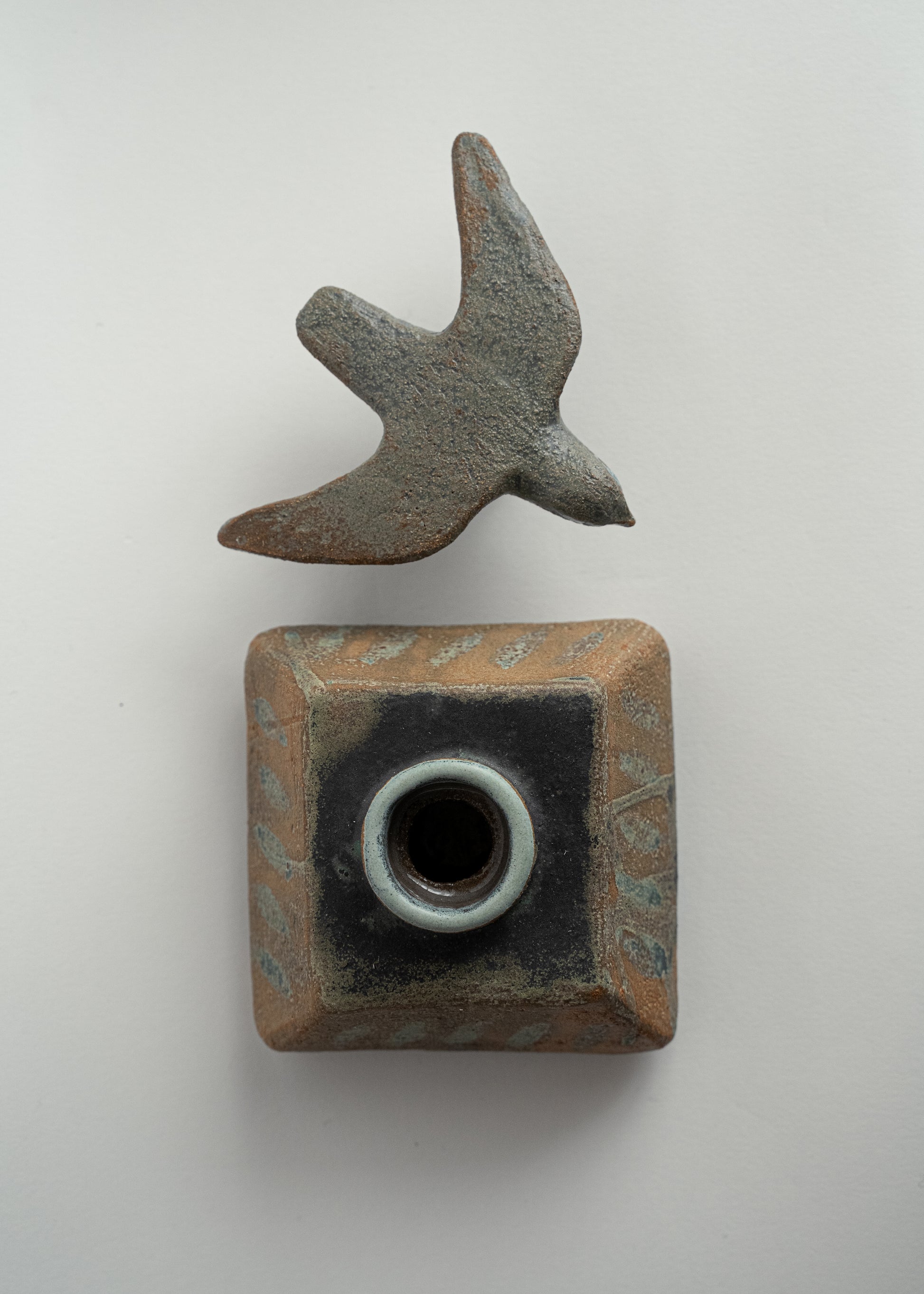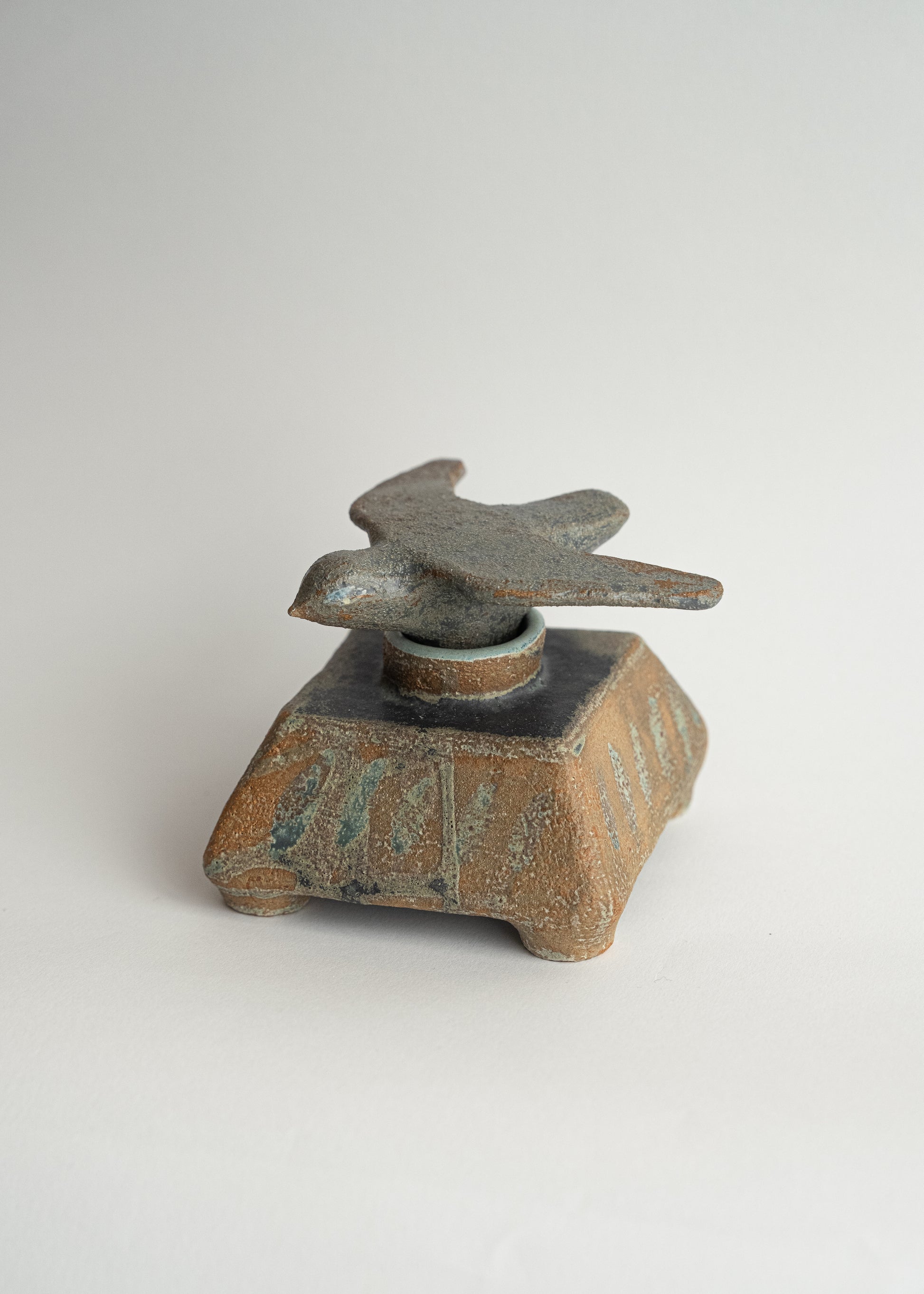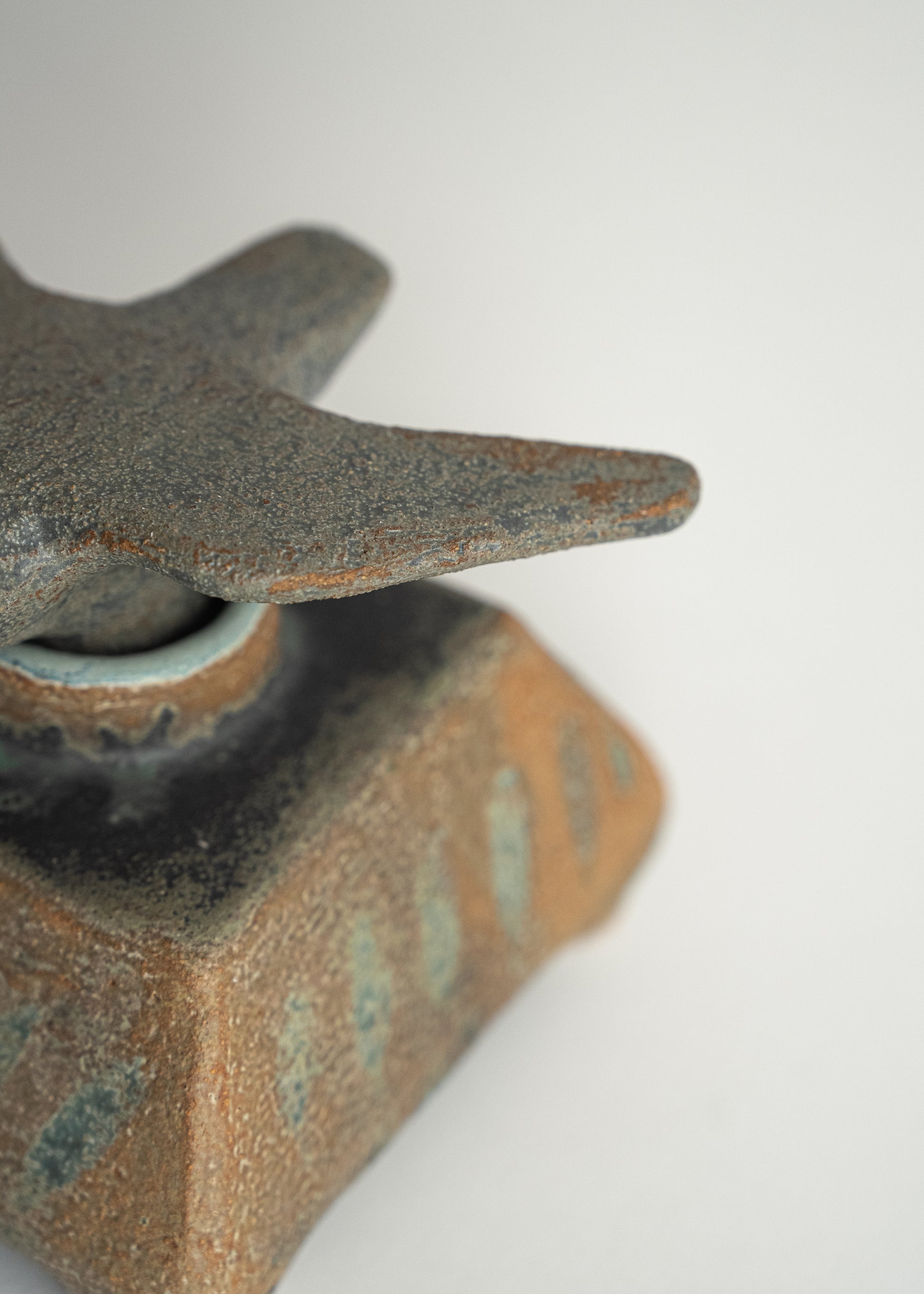 Sculptural object composed of two pieces, each hand built in pink chamotte stoneware and fired at 1250º. Finished with a green matte glaze with hand painted details. Interior glazed, perfect to store dried flowers, seeds or incense cones to subtly scent the environment.